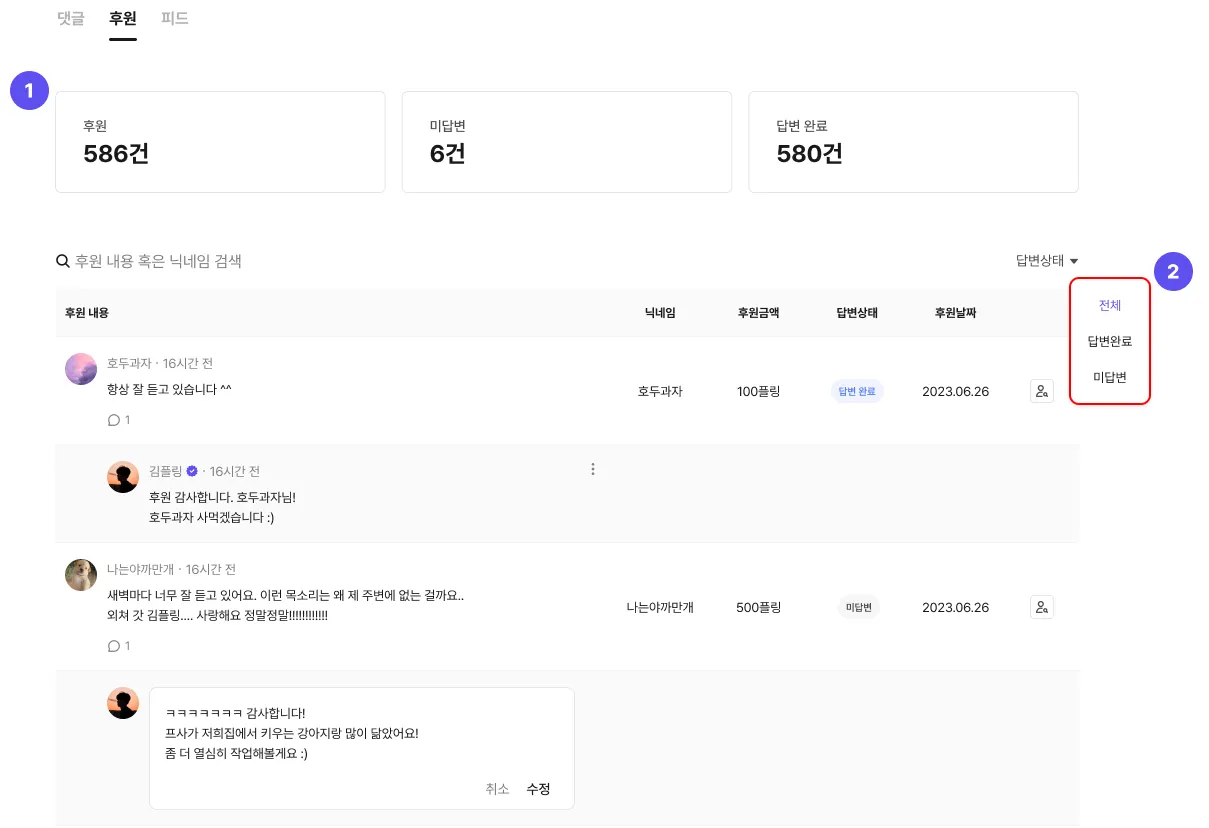 ① 후원 현황 : 누적 후원 수, 답변 현황을 한 눈에 확인할 수 있어요.