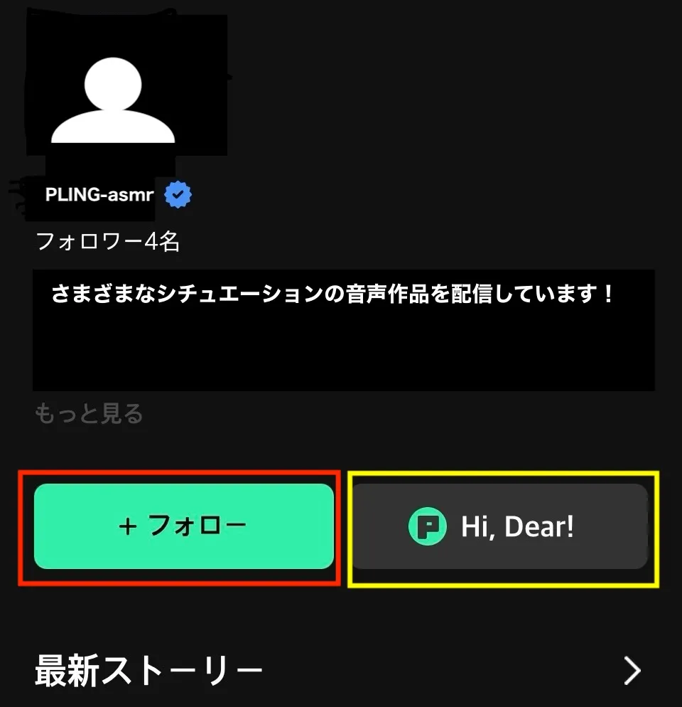 フォローしたクリエイターを応援したいときは、黄色の枠「Hi, Dear!」をタップし、