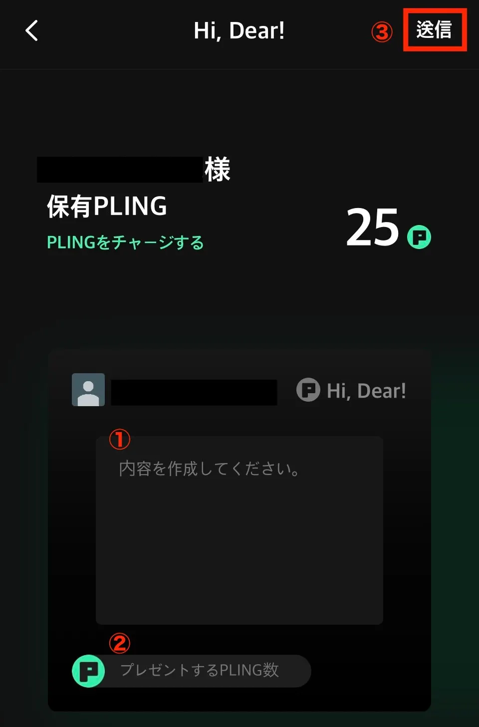 ②ギフトとしてプレゼントするPLING数(10PLING〜送付可能)を入力します。