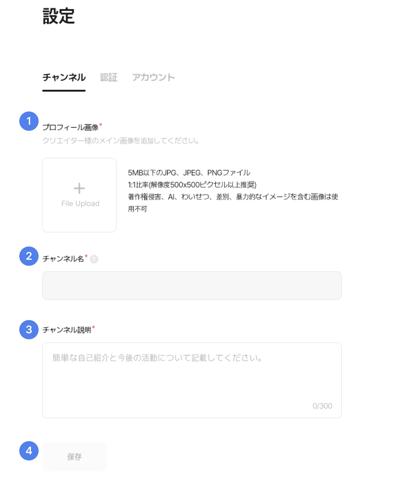 ③チャンネルの説明 : クリエイター様のチャンネルを紹介できる紹介文を書いてください。チャンネルの説明はクリエイター様の作品を聴く全てのユーザーに露出され、詳しい内容ほど、ユーザーの購入につながります!