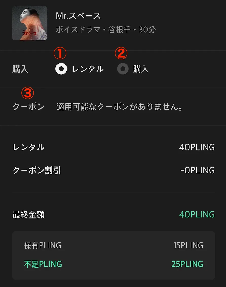 「レンタル」もしくは「購入」のどちらかを選択します。