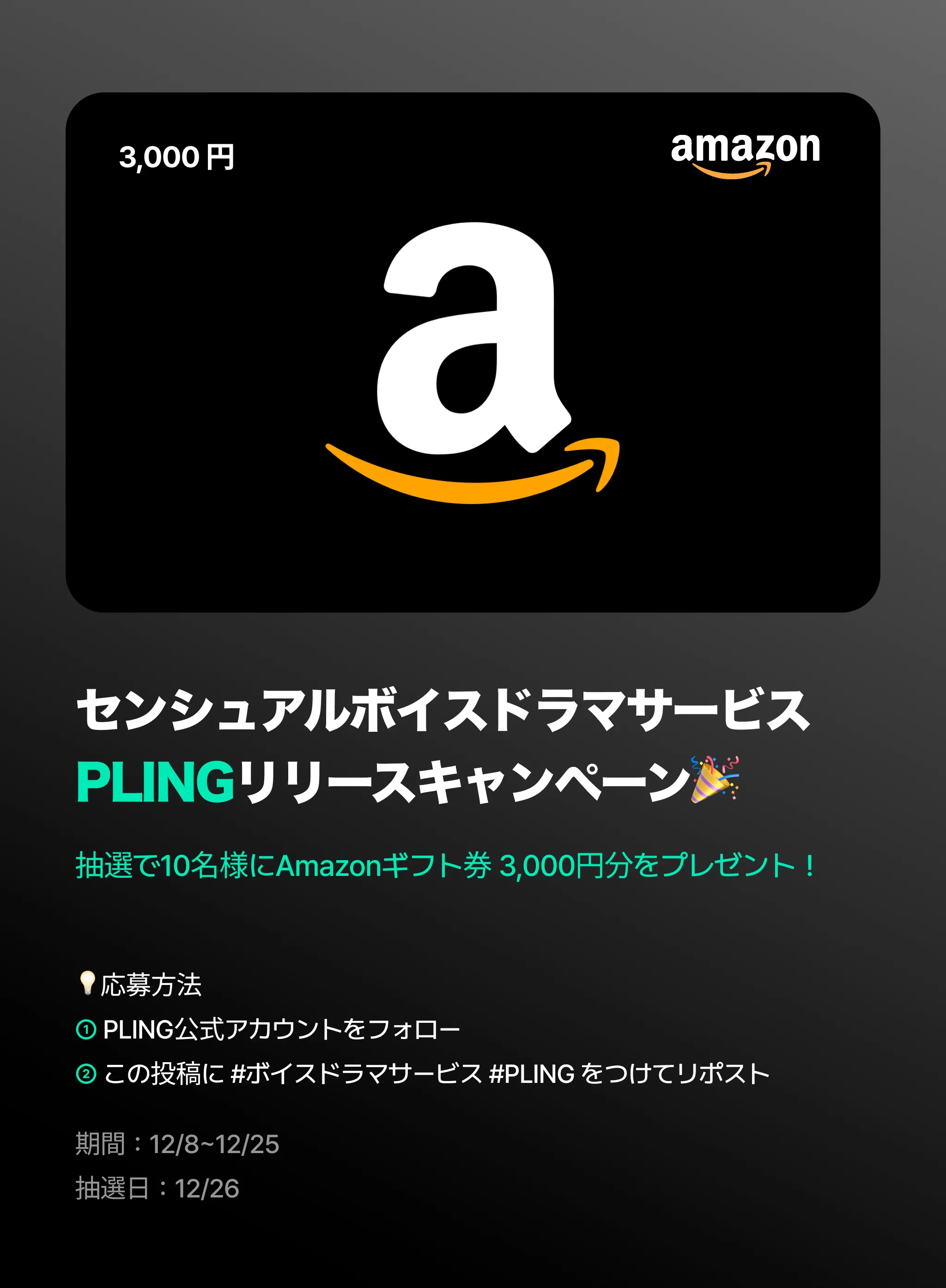 PLING公式アカウントをフォロー&リポストいただいた方の中から抽選で10名様に、Amazonギフト券3,000円分をプレゼント!公式Xでは新作情報やイベント告知など、最新情報を発信しておりますので是非チェックしてくださいね!