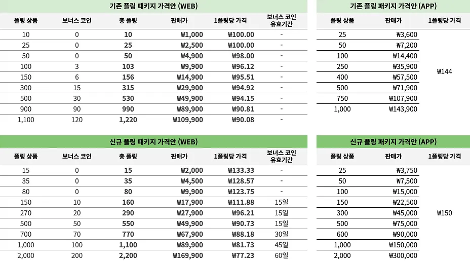 새로운 플링 가격표 반영에 따라 1플링의 기본 단가 가격이 아래와 같이 변경됩니다.