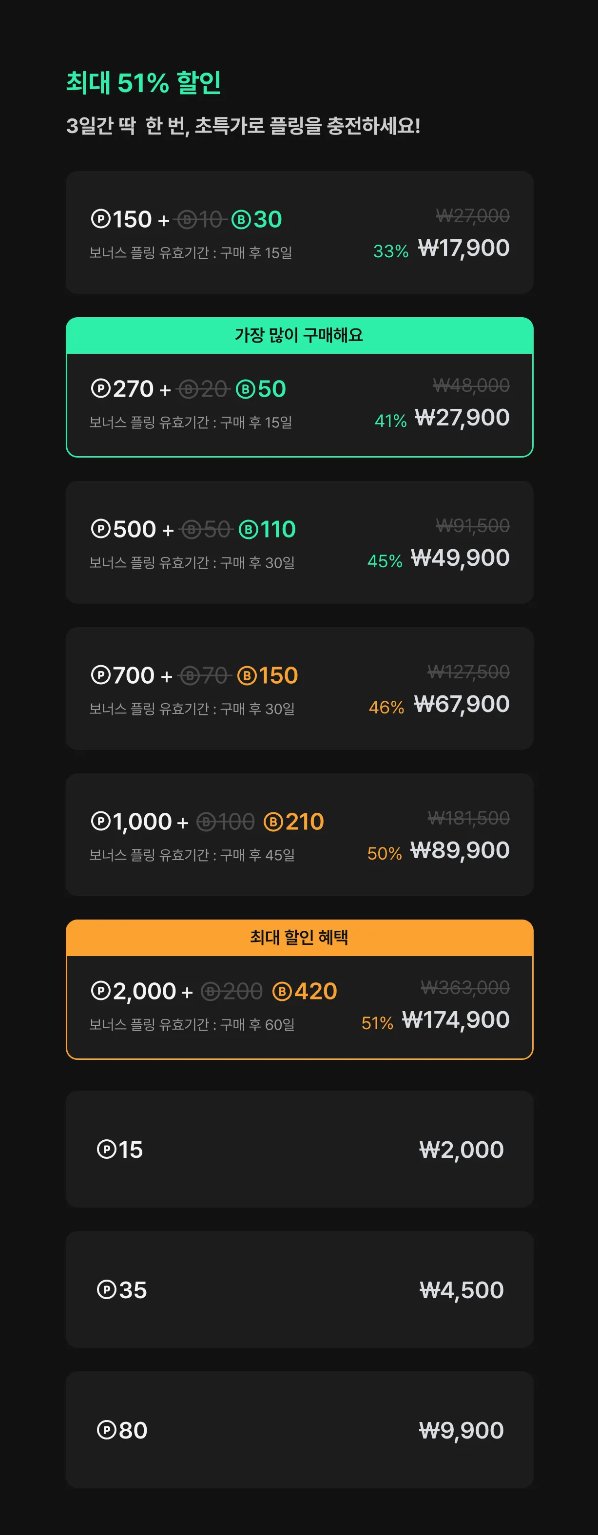 → 신규: 80 플링 패키지 | 9,900원 (1플링당 123.7원)
