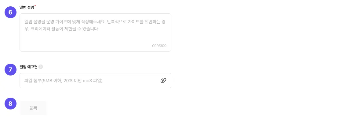 ⑧ 등록 : 최종 검토 후 등록 버튼을 클릭하여 앨범 등록을 완료해주세요!