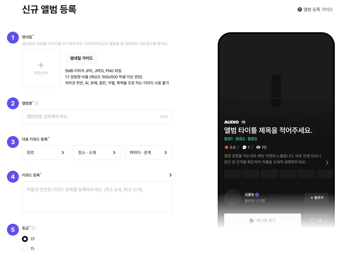 ⑦ 앨범 예고편 : 앨범 예고편 기능을 활용하여 구매 전, 망설이는 유저분들에게 크리에이터님의 목소리를 들려주세요!