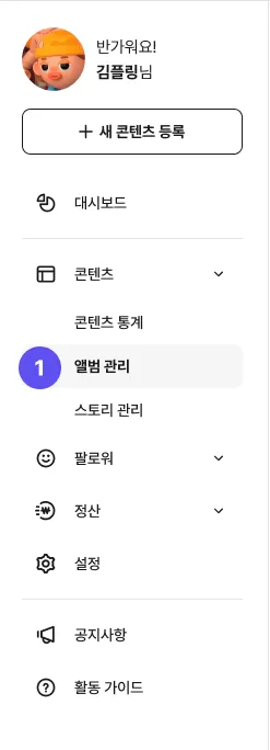 ① 대시보드 - 좌측 네비게이션 바 앨범 관리 또는 + 새 콘텐츠 등록을 클릭해주세요.