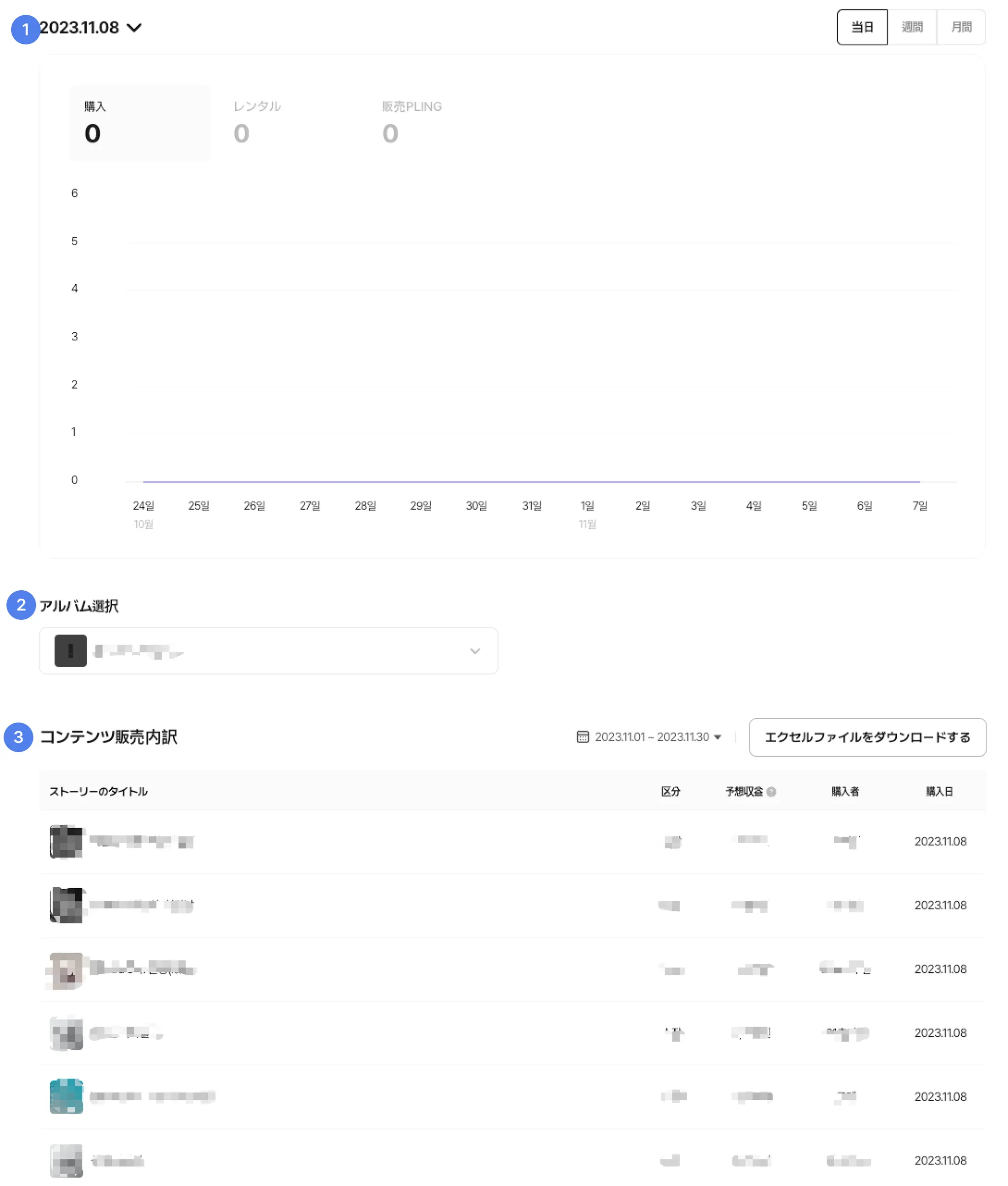 ③ コンテンツ販売内訳 : 選択したアルバムの販売履歴を照会することができます。