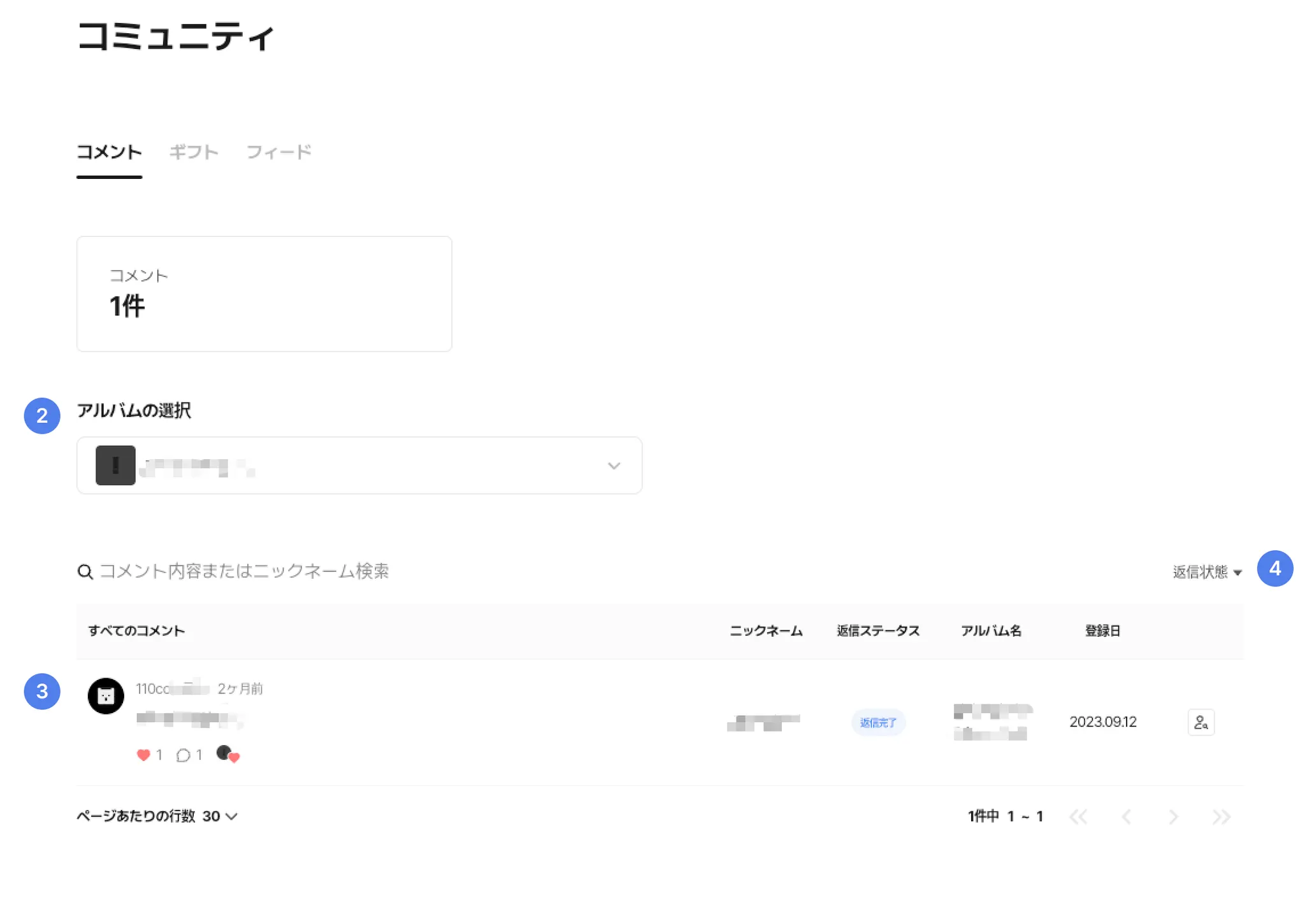 ② アルバム選択 : コメントを確認したいアルバム名を選択します。