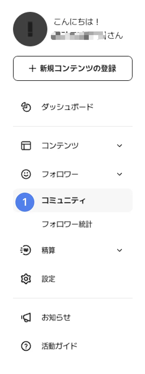 ① コメント/ギフト/フィード管理 : 左側メニューバーより、 コミュニティ をクリックします。
