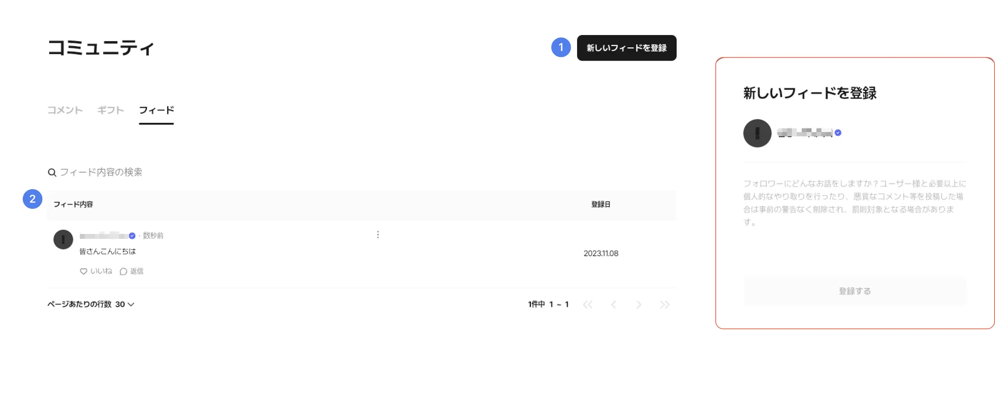 ② フィード内容 : フィード内容を確認し、投稿されたコメントを管理できます。