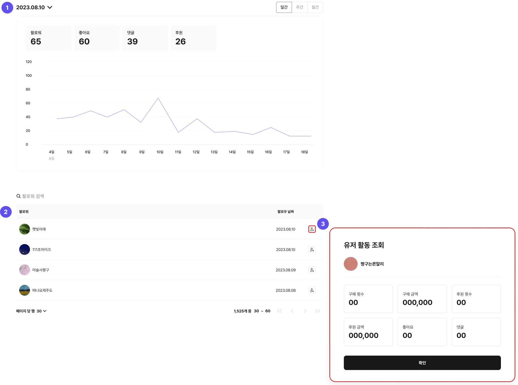 ③ 유저 활동 조회 : 내 작품 구매를 얼마나 했는지, 얼마나 반응 했는지에 대해 확인할 수 있습니다.