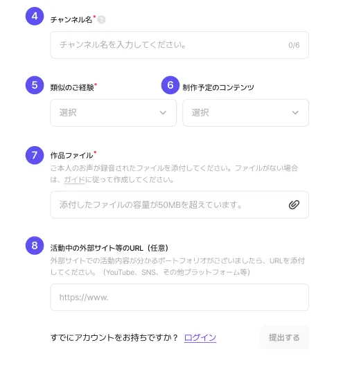 ⑦作品ファイル:審査用に、ボイスサンプルが入ったポートフォリオを添付してください。