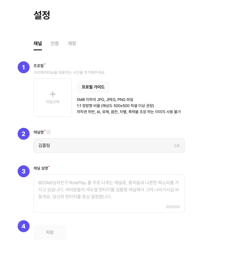 ② 채널명 : 유저들에게 보여질 채널명이 노출됩니다.