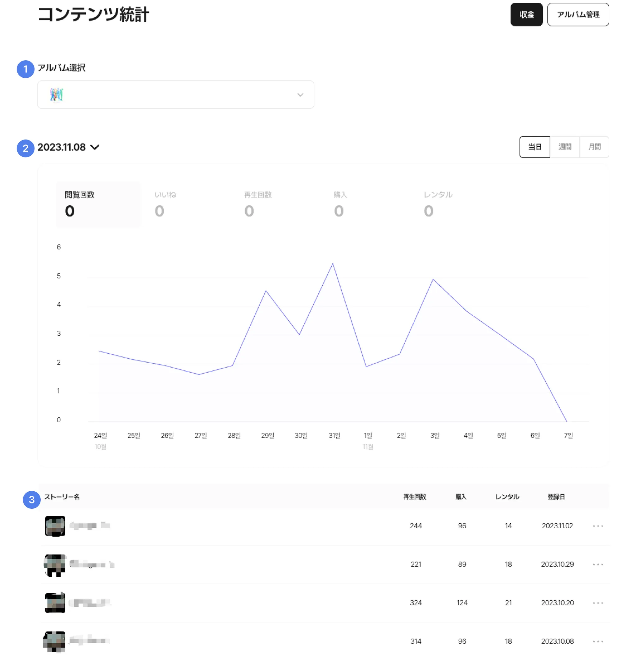 ② コンテンツ統計チャート : 当日/週間/月間のアルバム別統計を確認することができます。